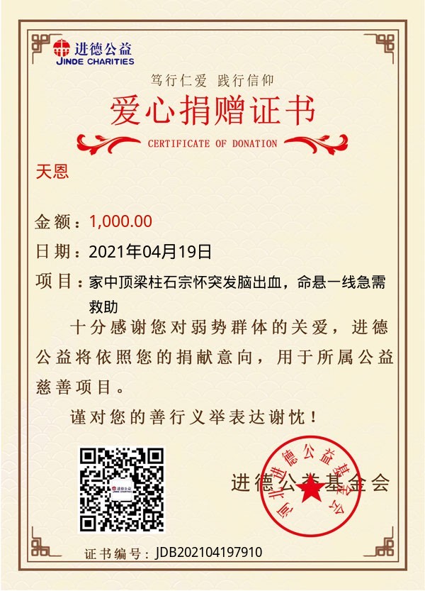 | 天恩 | 1,000.00 | 苦命家庭接二连三遭变故,谁来拯救突发脑梗的刘明章? | 捐款证书 | 2021-04-19 |