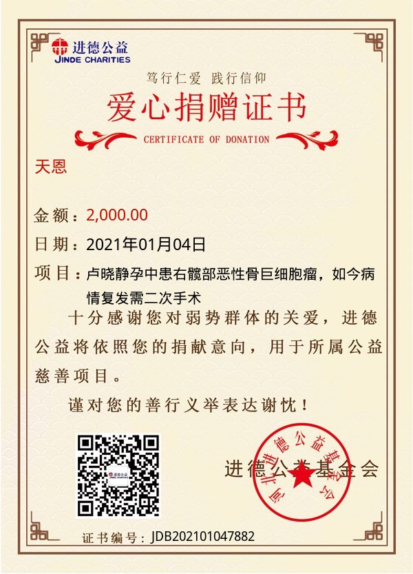 | 天恩 | 2,000.00 | 卢晓静孕中患右髋部恶性骨巨细胞瘤,如今病情复发需二次手术 | 捐款证书 | 2021-01-04 |