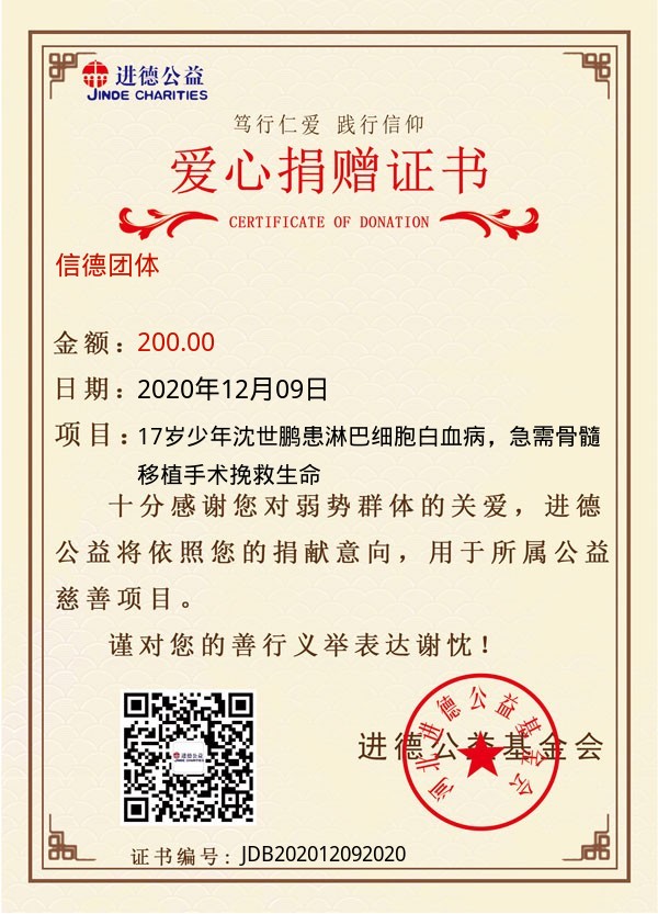 | 信德团体 | 200.00 | 17岁少年沈世鹏患淋巴细胞白血病,急需骨髓移植手术挽救生命 | 捐款证书 | 2020-12-09 |
