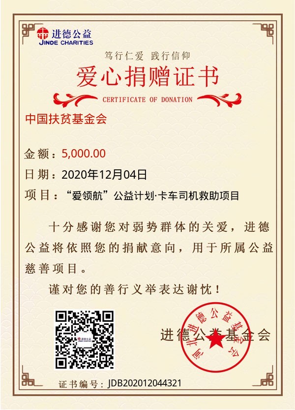| 中国扶贫基金会 | 5,000.00 | “爱领航”公益计划·卡车司机救助项目 | 捐款证书 | 2020-12-04 |