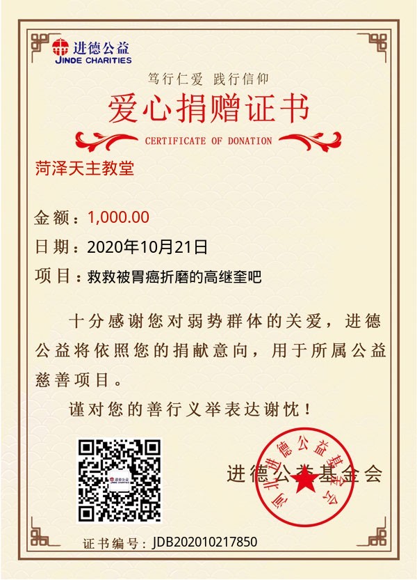 | 菏泽天主教堂 | 1,000.00 | 救救被胃癌折磨的高继奎吧 | 捐款证书 | 2020-10-21 |