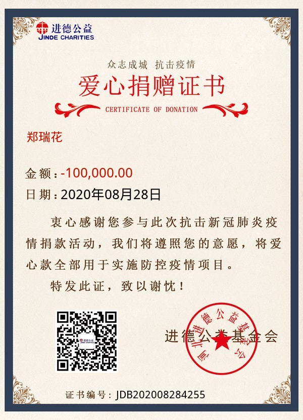 | 郑瑞花 | -100,000.00 | 抗击新冠肺炎:海外援助项目 | 捐款证书 | 2020-08-28 |