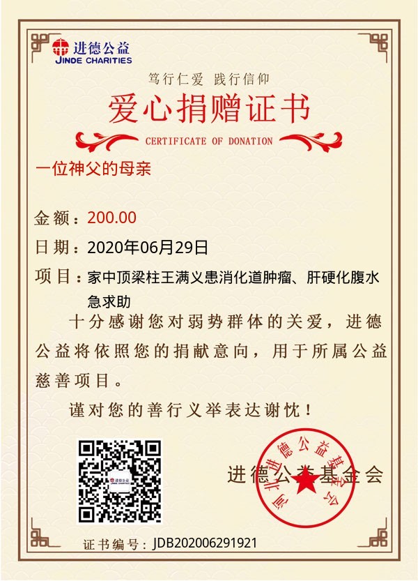 | 一位神父的母亲 | 200.00 | 家中顶梁柱王满义患消化道肿瘤、肝硬化腹水急求助 | 捐款证书 | 2020-06-29 |