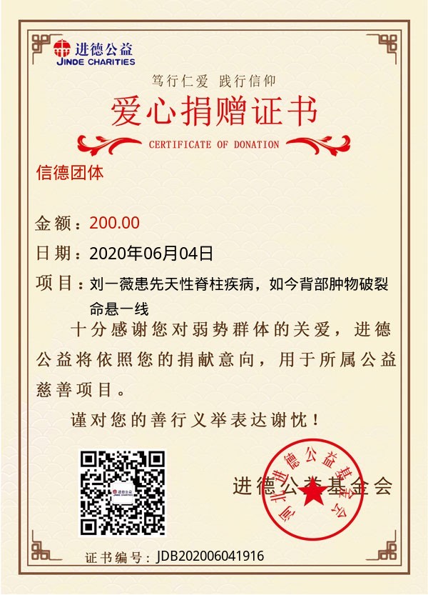 | 信德团体 | 200.00 | 刘一薇患先天性脊柱疾病,如今背部肿物破裂命悬一线 | 捐款证书 | 2020-06-04 |