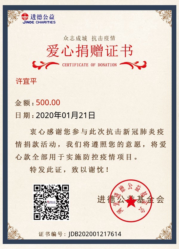 | 许宜平 | 500.00 | 武汉告急:缺乏防护物资!请求支援! | 捐款证书 | 2020-01-21 |