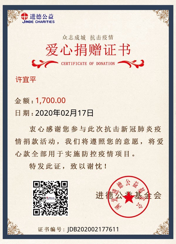 | 许宜平 | 1,700.00 | 武汉告急:缺乏防护物资!请求支援! | 捐款证书 | 2020-02-17 |