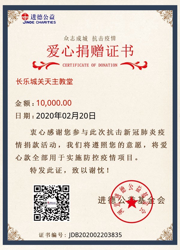| 长乐城关天主教堂 | 10,000.00 | 武汉告急:缺乏防护物资!请求支援! | 捐款证书 | 2020-02-20 |