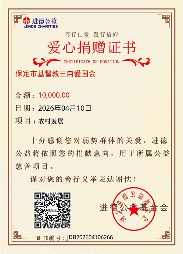 | 保定市基督教三自爱国会 | 10,000.00 | 农村发展 | 捐款证书 | 2026-04-10 |