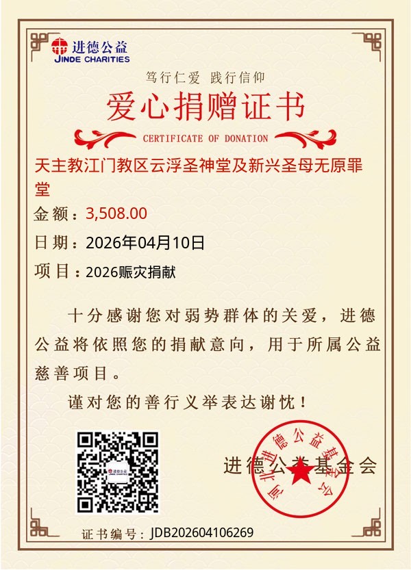 | 天主教江门教区云浮圣神堂及新兴圣母无原罪堂 | 3,508.00 | 2026赈灾捐献 | 捐款证书 | 2026-04-10 |