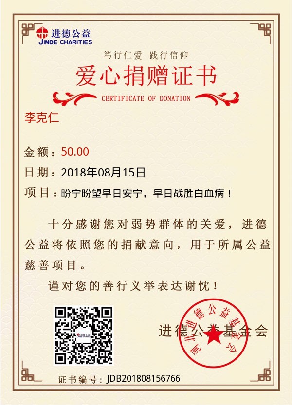 | 李克仁 | 50.00 | 盼宁盼望早日安宁,早日战胜白血病! | 捐款证书 | 2018-08-15 |