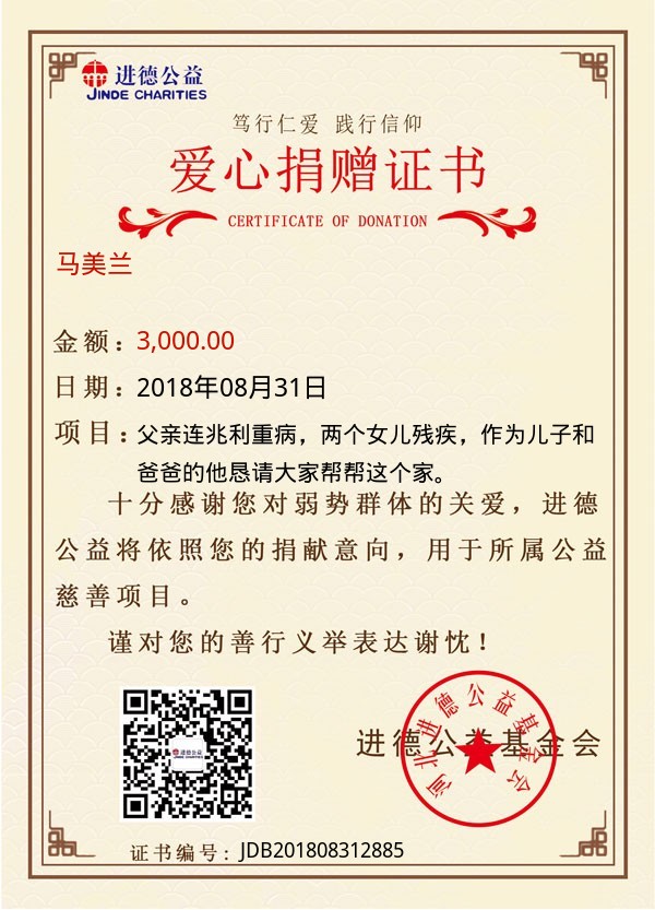 | 马美兰 | 3,000.00 | 父亲连兆利重病,两个女儿残疾,作为儿子和爸爸的他恳请大家帮帮这个家。 | 捐款证书 | 2018-08-31 |