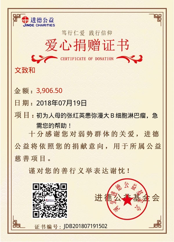 | 文致和 | 3,906.50 | 初为人母的张红英患弥漫大B细胞淋巴瘤,急需您的帮助! | 捐款证书 | 2018-07-19 |