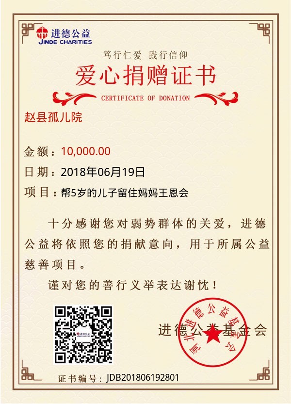 | 赵县孤儿院 | 10,000.00 | 帮5岁的儿子留住妈妈王恩会 | 捐款证书 | 2018-06-19 |