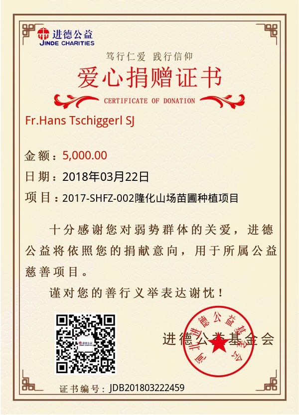 | Fr.Hans Tschiggerl SJ | 5,000.00 | 2017-SHFZ-002隆化山场苗圃种植项目 | 捐款证书 | 2018-03-22 |