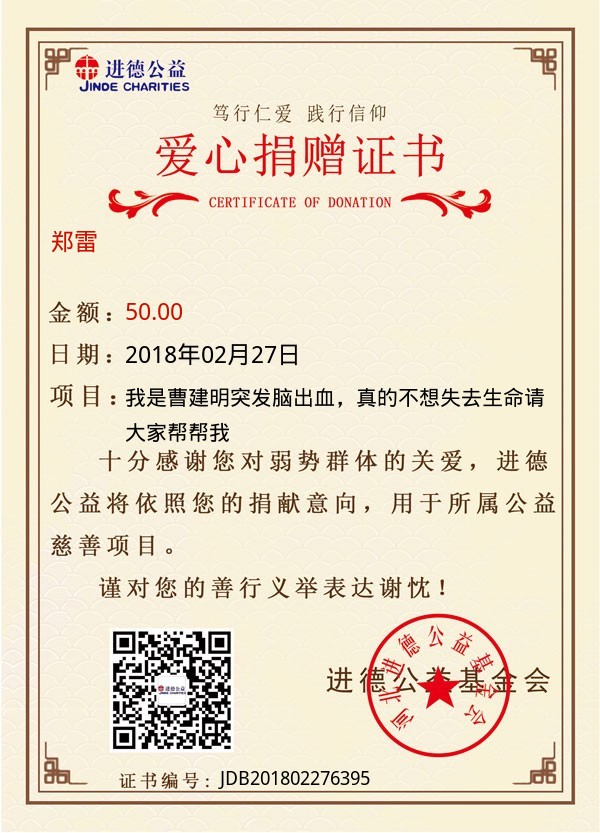 | 郑雷 | 50.00 | 我是曹建明突发脑出血,真的不想失去生命请大家帮帮我 | 捐款证书 | 2018-02-27 |