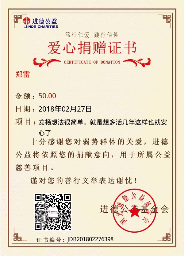 | 郑雷 | 50.00 | 龙杨想法很简单,就是想多活几年这样也就安心了 | 捐款证书 | 2018-02-27 |