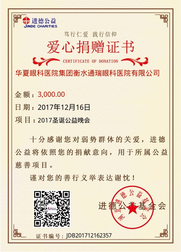 | 华夏眼科医院集团衡水通瑞眼科医院有限公司 | 3,000.00 | 2017圣诞公益晚会 | 捐款证书 | 2017-12-16 |