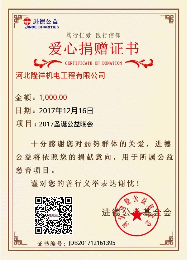 | 河北隆祥机电工程有限公司 | 1,000.00 | 2017圣诞公益晚会 | 捐款证书 | 2017-12-16 |