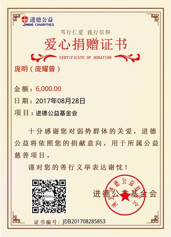 | 庞明(庞耀曾) | 6,000.00 | 进德公益基金会 | 捐款证书 | 2017-08-28 |