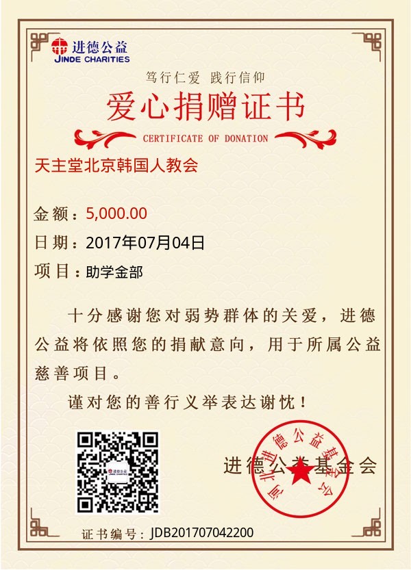 | 天主堂北京韩国人教会 | 5,000.00 | 助学金部 | 捐款证书 | 2017-07-04 |
