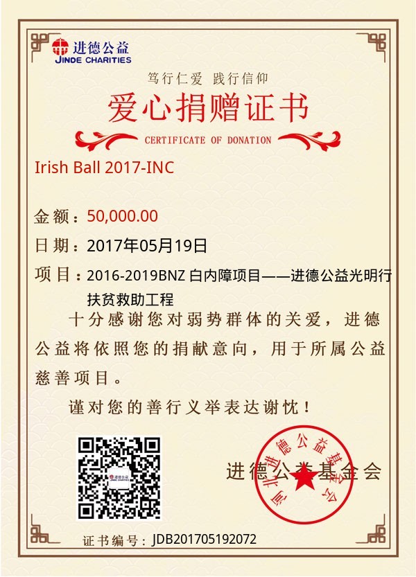 | Irish Ball 2017-INC | 50,000.00 | 2016-2019BNZ 白内障项目——进德公益光明行扶贫救助工程 | 捐款证书 | 2017-05-19 |