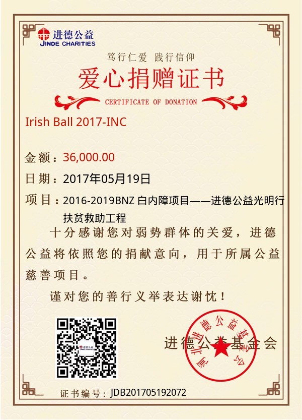 | Irish Ball 2017-INC | 36,000.00 | 2016-2019BNZ 白内障项目——进德公益光明行扶贫救助工程 | 捐款证书 | 2017-05-19 |