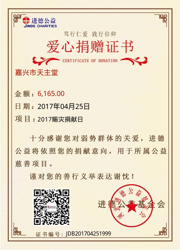 | 嘉兴市天主堂 | 6,165.00 | 2017赈灾捐献日 | 捐款证书 | 2017-04-25 |