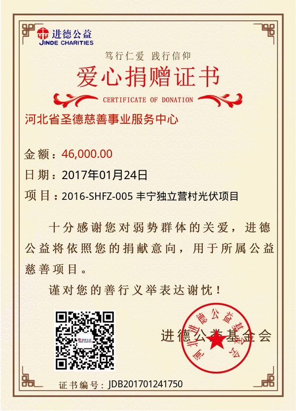 | 河北省圣德慈善事业服务中心 | 46,000.00 | 2016-SHFZ-005 丰宁独立营村光伏项目 | 捐款证书 | 2017-01-24 |