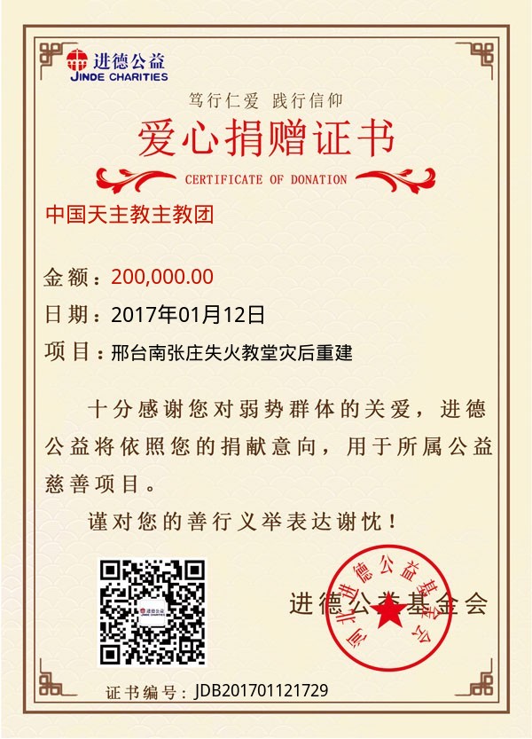 | 中国天主教主教团 | 200,000.00 | 邢台南张庄失火教堂灾后重建 | 捐款证书 | 2017-01-12 |