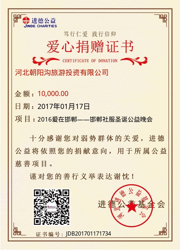| 河北朝阳沟旅游投资有限公司 | 10,000.00 | 2016爱在邯郸——邯郸社服圣诞公益晚会 | 捐款证书 | 2017-01-17 |
