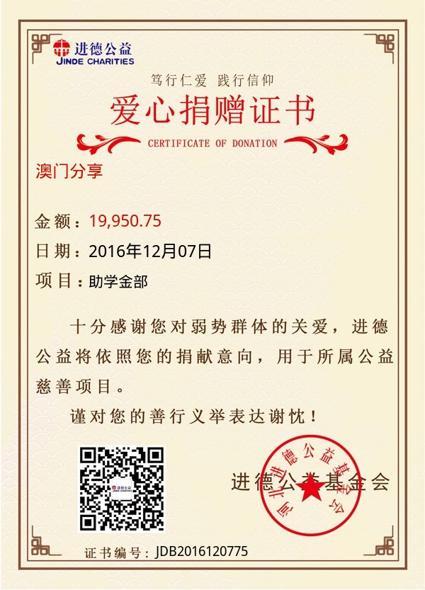 | 澳门分享 | 19,950.75 | 助学金部 | 捐款证书 | 2016-12-07 |