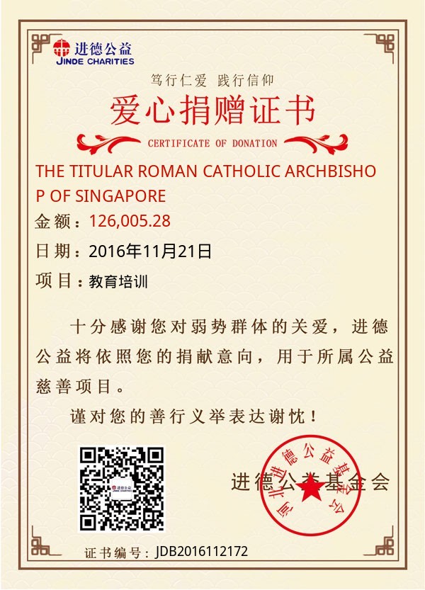 | THE TITULAR ROMAN CATHOLIC ARCHBISHOP OF SINGAPORE | 126,005.28 | 教育培训 | 捐款证书 | 2016-11-21 |