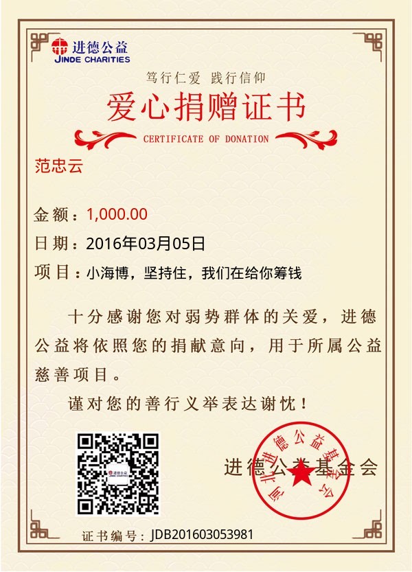 | 范忠云 | 1,000.00 | 小海博,坚持住,我们在给你筹钱 | 捐款证书 | 2016-03-05 |