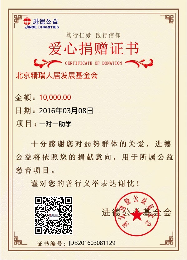 | 北京精瑞人居发展基金会 | 10,000.00 | 一对一助学 | 捐款证书 | 2016-03-08 |