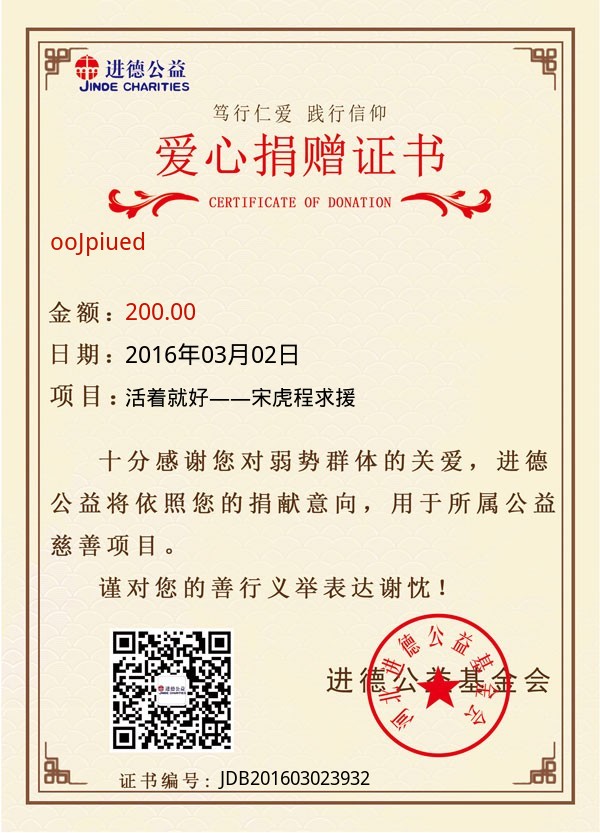 | ooJpiued | 200.00 | 活着就好——宋虎程求援 | 捐款证书 | 2016-03-02 |