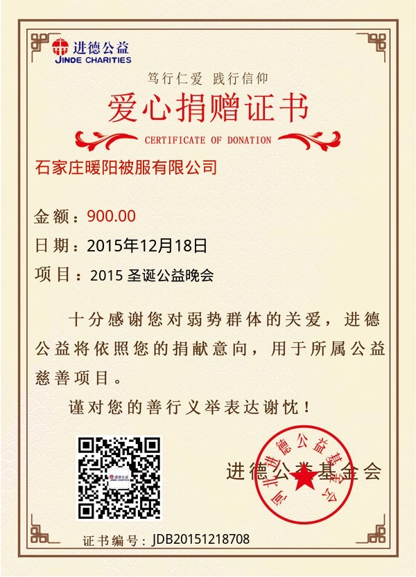 | 石家庄暖阳被服有限公司 | 900.00 | 2015 圣诞公益晚会 | 捐款证书 | 2015-12-18 |