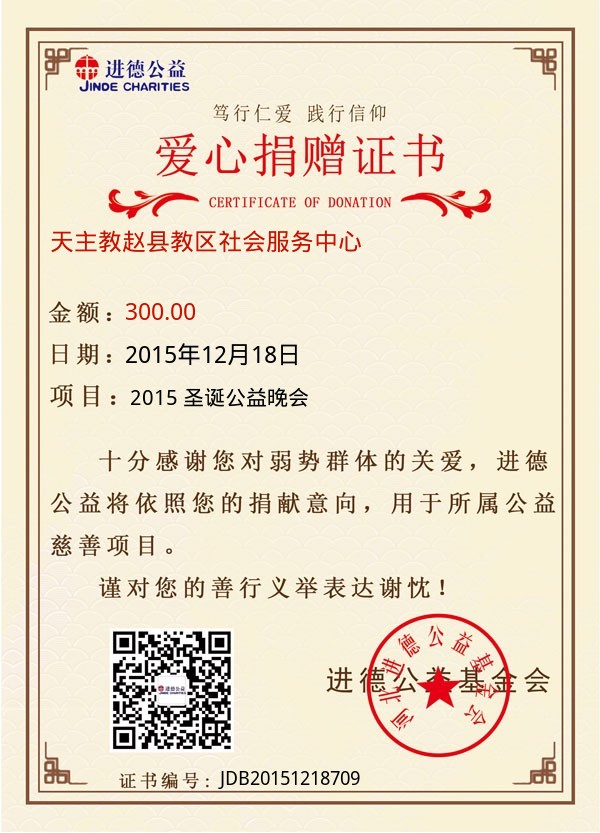 | 天主教赵县教区社会服务中心 | 300.00 | 2015 圣诞公益晚会 | 捐款证书 | 2015-12-18 |
