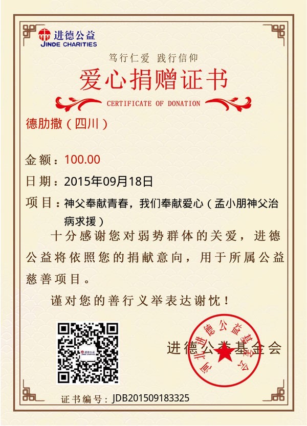| 德肋撒(四川) | 100.00 | 神父奉献青春,我们奉献爱心(孟小朋神父治病求援) | 捐款证书 | 2015-09-18 |