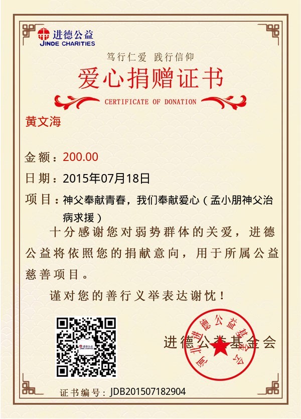 | 黄文海 | 200.00 | 神父奉献青春,我们奉献爱心(孟小朋神父治病求援) | 捐款证书 | 2015-07-18 |