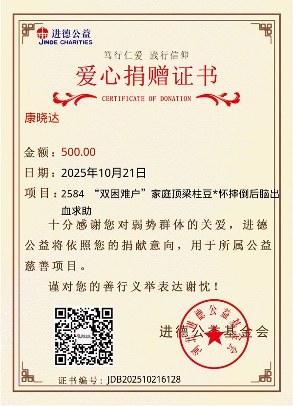 2584 “双困难户”家庭顶梁柱豆*怀摔倒后脑出血求助 |