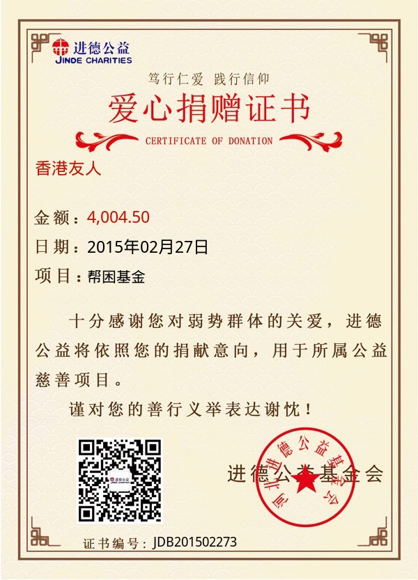 | 香港友人 | 4,004.50 | 帮困基金 | 捐款证书 | 2015-02-27 |