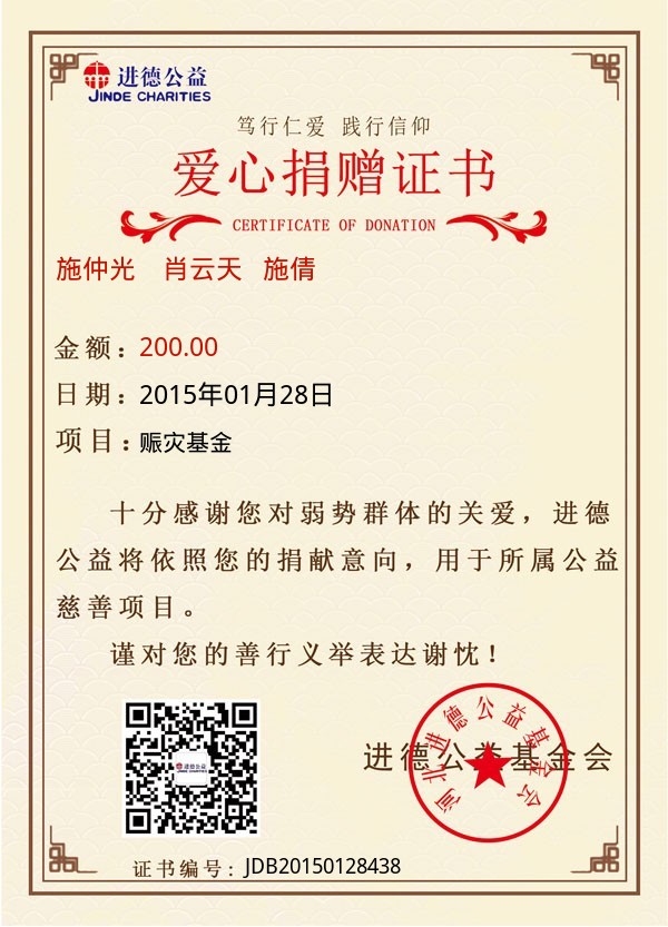 | 施仲光 肖云天 施倩 | 200.00 | 赈灾基金 | 捐款证书 | 2015-01-28 |