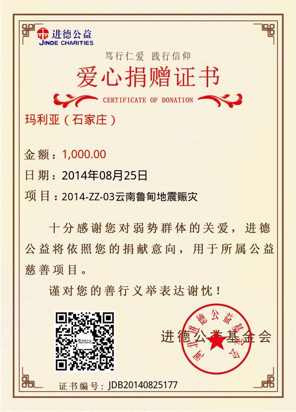 | 玛利亚(石家庄) | 1,000.00 | 2014-ZZ-03云南鲁甸地震赈灾 | 捐款证书 | 2014-08-25 |