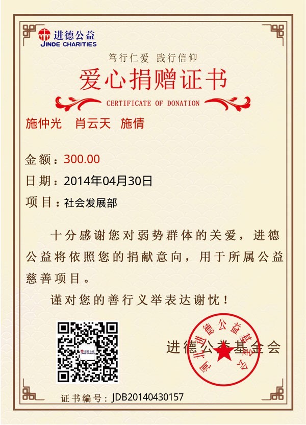 | 施仲光 肖云天 施倩 | 300.00 | 社会发展部 | 捐款证书 | 2014-04-30 |