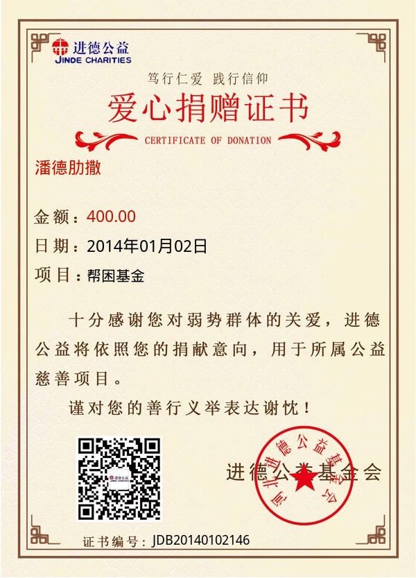 | 潘德肋撒 | 400.00 | 帮困基金 | 捐款证书 | 2014-01-02 |