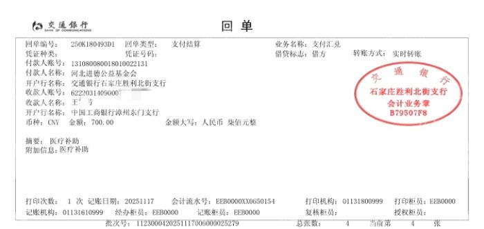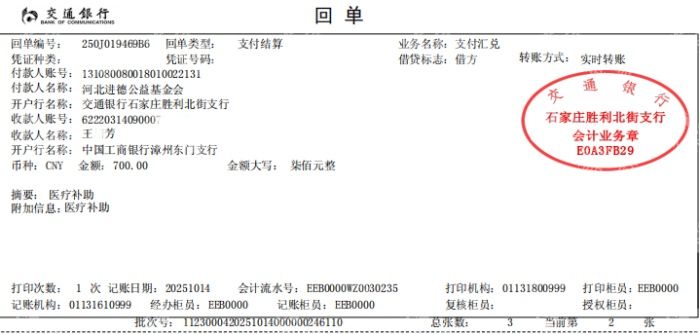 第一笔善款支付凭证(由于患者情况特殊,应社区、推荐人及服务人员共同商议,要求每月支付700元。)