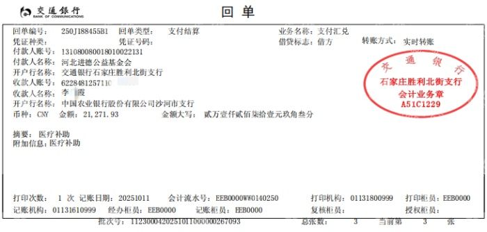 第一笔善款支付凭证,由于患者无儿无女,一直是妹妹李*霞在照顾,患者一直处于昏迷状态,所以只能打到患者妹妹卡上,由妹妹支付所用医疗费用。