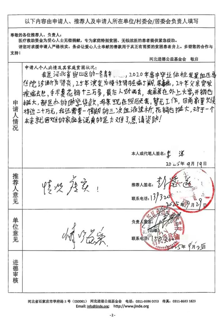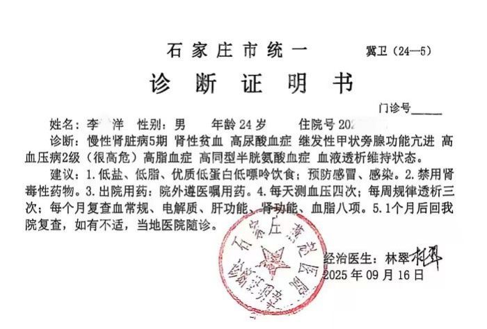 我是河北省邯山区的一名青年,2020 年高中毕业时,一次常规体检打破了原本平静的生活 —— 血压检测结果异常偏高。为查明原因,我前往医院住院检查,最终被确诊为肾炎。本以为积极治疗就能控制病情,可命运却不断加码,到 2025 年,我的病情已恶化至慢性肾脏病 5 期,也就是大家常说的尿毒症。
