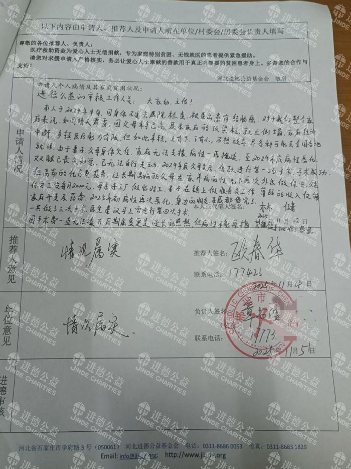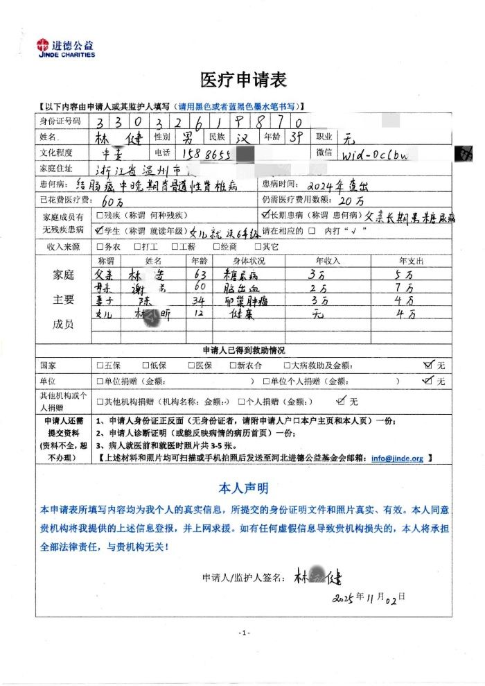 我才正值壮年,实在放不下需要常年服药的父母、妻子,更舍不得还在上六年级的女儿,不想让这个家就此散了。在此,我含泪恳请社会各界的爱心人士,能伸出援手,帮我们家渡过这个生死难关。每一份善意、每一笔捐款,都能为我带来活下去的希望,也能让这个濒临破碎的家庭重新看到曙光。感谢每一位愿意帮助我们的好心人,这份恩情我们将永远铭记于心!