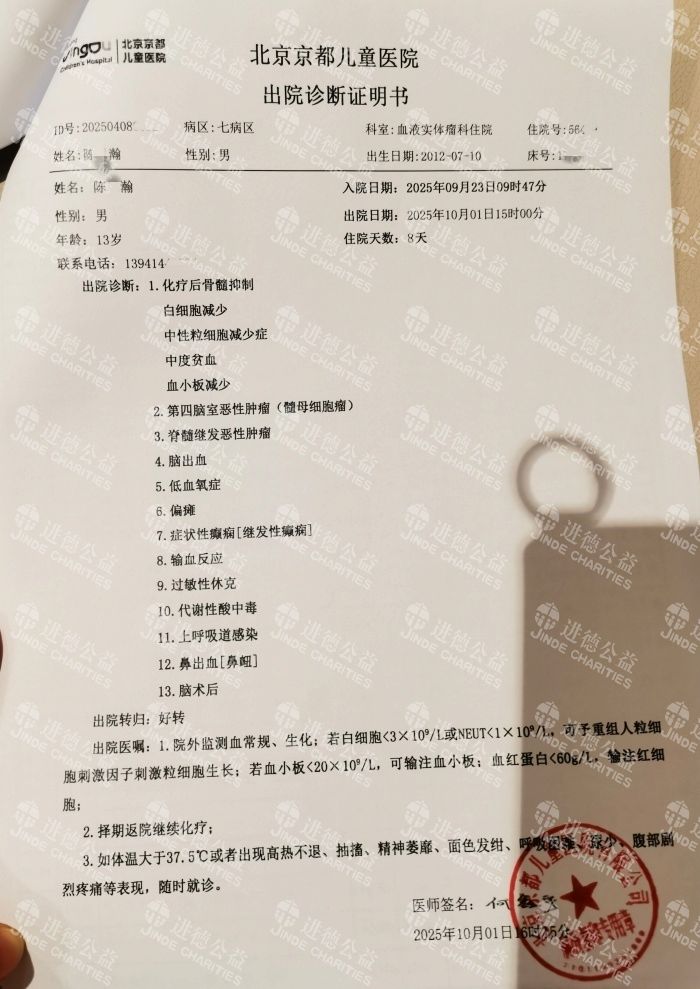 2020 年元旦,本是阖家欢庆的时刻,我的儿子陈 * 瀚却因持续呕吐被确诊髓母细胞瘤。这个噩耗,瞬间将我们平凡家庭拖入绝望。我们当即奔赴北京天坛医院,紧急施行腹部引流术降压,1 月 15 日再行肿瘤切除。术后孩子虚弱的模样,至今刻在我心上。为求根治,3 月我们辗转至山东淄博万杰肿瘤医院接受质子放疗,5 月转回北京世纪坛医院化疗,历经一年辗转,终于在 2021 年 3 月结疗。我们以为苦难终了,能陪孩子安稳长大。
